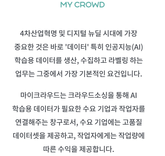4차 산업혁명 마이크로 클라우드는 AI 학습 데이터가 필요한 기업과 근로자를 함께 크라우드소싱하는 창구다. 수요 기업에 고품질 데이터 세트를 제공하고 작업자의 작업량에 따라 이익을 제공합니다.