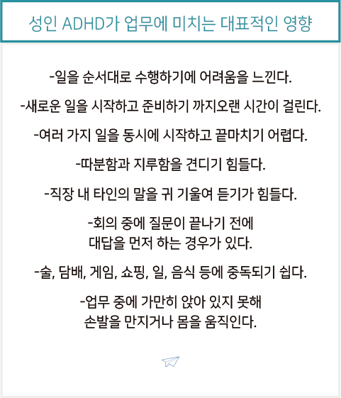 성인 ADHD는 일상생활과 업무에 큰 어려움을 초래할 수 있습니다. 경제활동을 지속하기 어렵게 만들기 때문에 다른 연쇄적인 문제를 유발한다는 점에서 주의와 관리가 필요하다. 처리 용량 부족 등으로 업무 처리 속도가 느려지거나, 잦은 오류로 업무 효율이 떨어진다. 환자가 직장 생활에서 직면하는 문제를 살펴봄으로써 더 많은 것을 배울 수 있습니다.