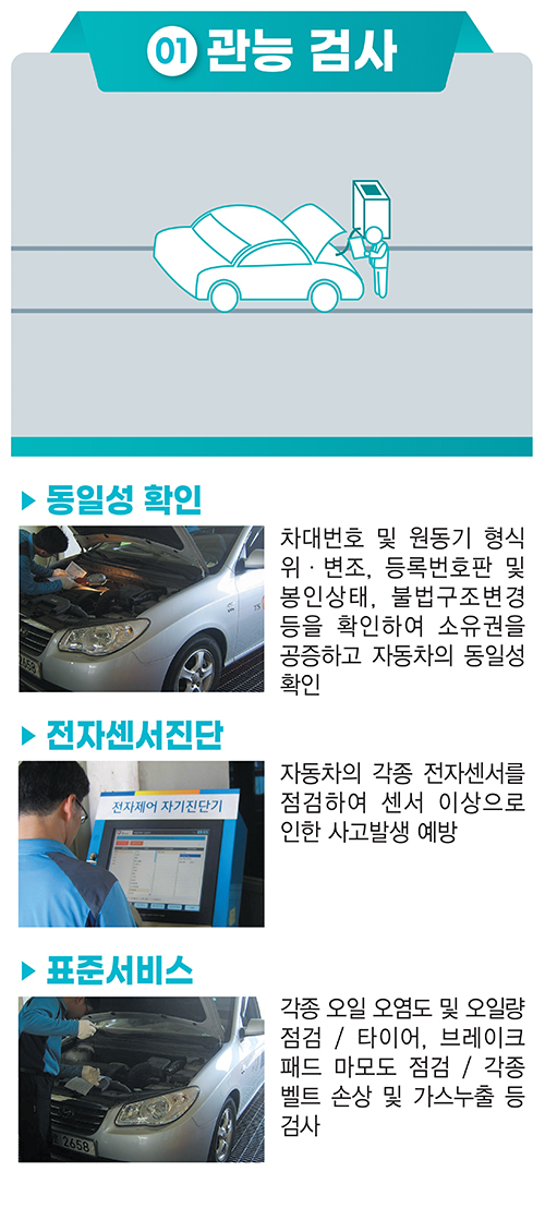 전기 및 전자: 전기 장치의 연결/손상된/절연 및 설치 상태를 확인하고 전자 제어 진단 도구로 각종 센서의 정상 작동 여부까지 확인합니다..