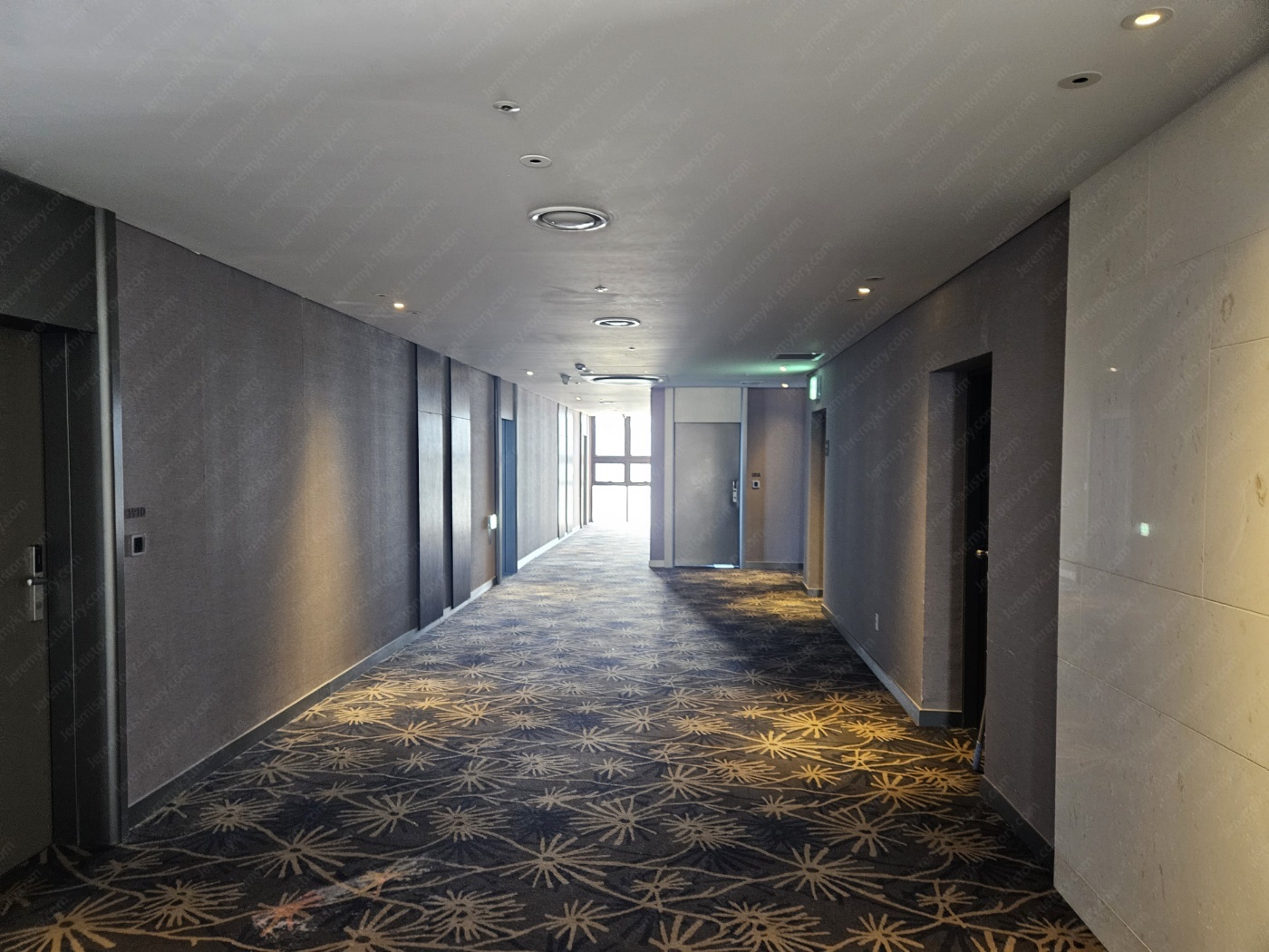객실로 이어지는 복도는 Sea Cruise Hotel 전체와 마찬가지로 현대적이고 깨끗합니다.
