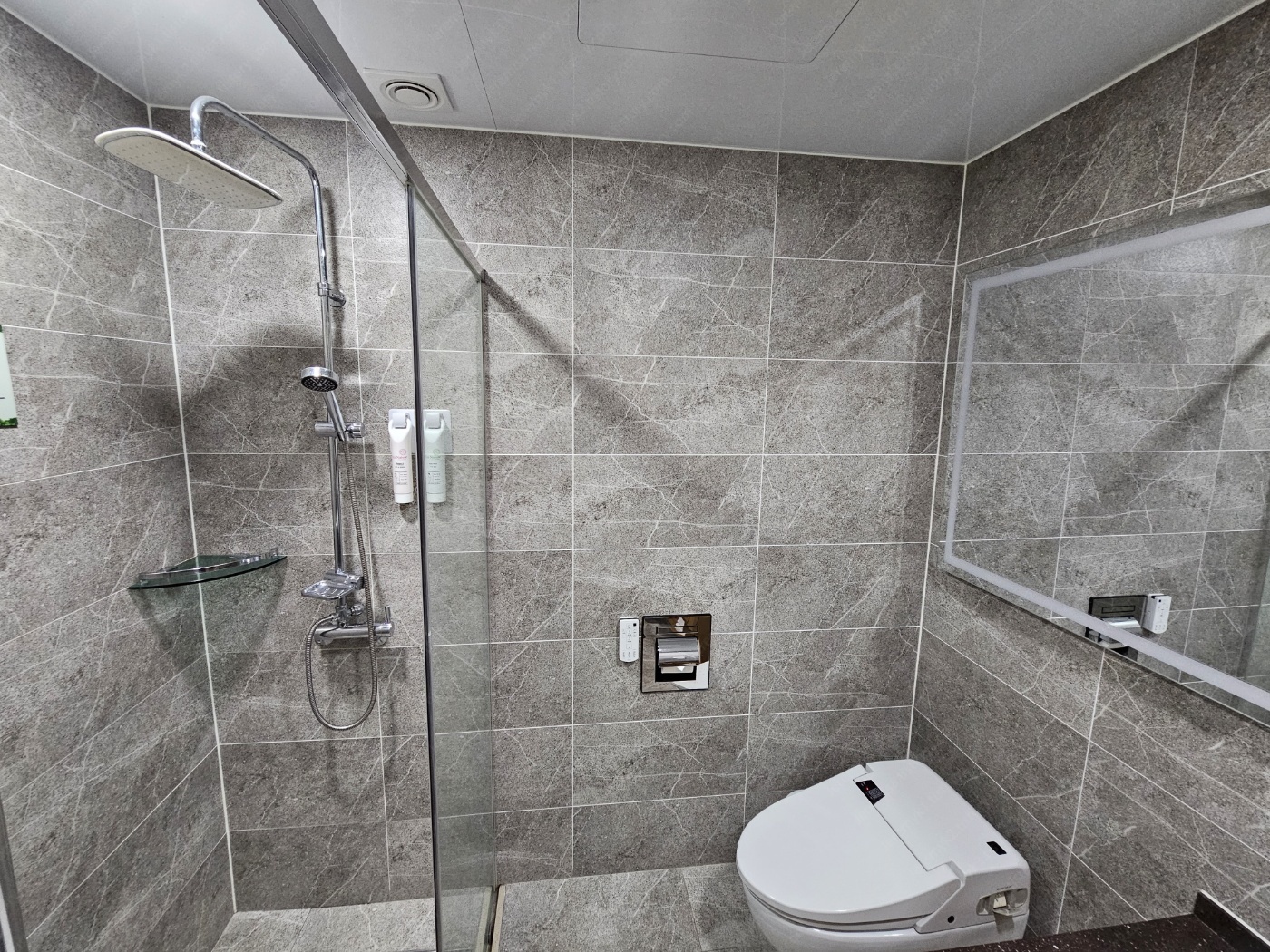 그레이 타일로 깔끔하고 모던한 분위기의 욕실입니다.