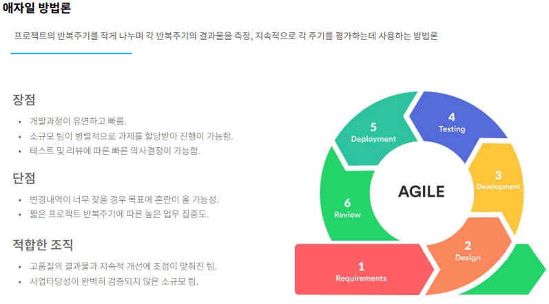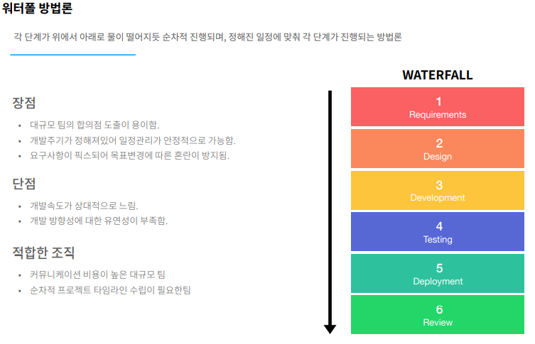 - 폭포: 인원이 많은 프로젝트에 적합하며 초기 방향을 잘못 설정하면 프로젝트 자체가 뒤집힐 수 있습니다.