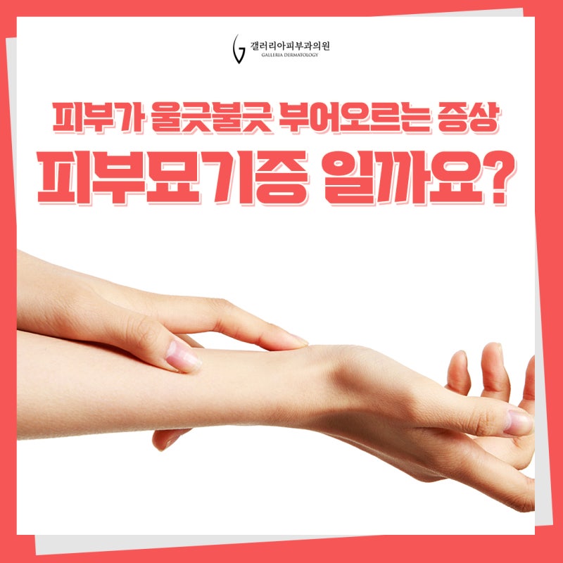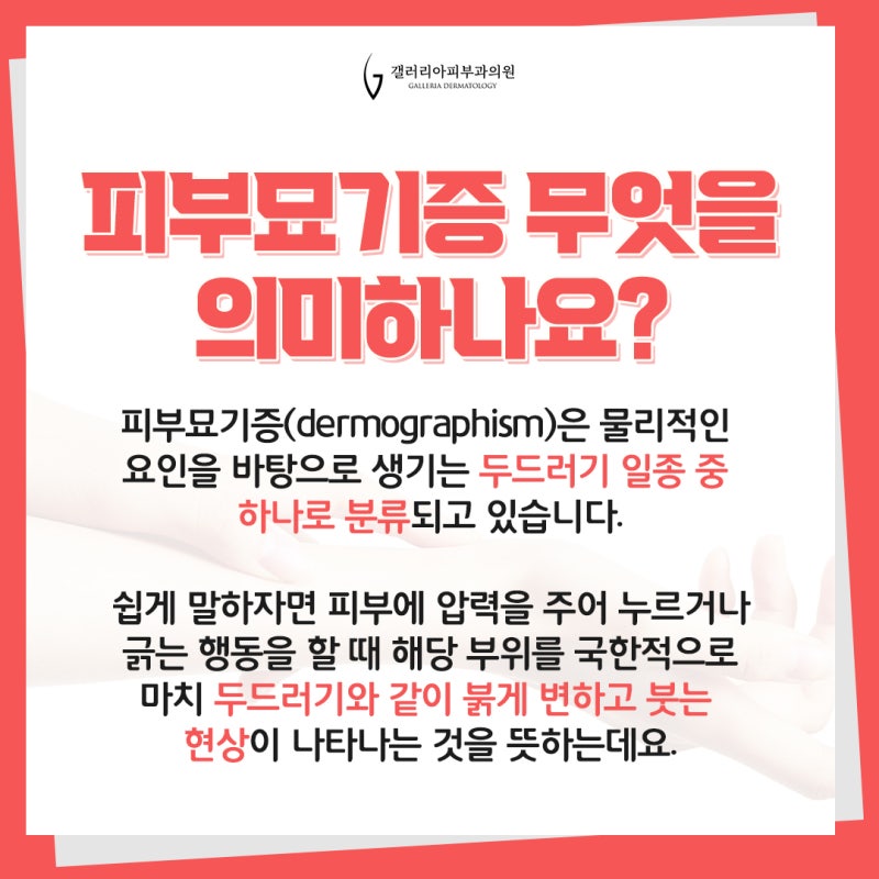 가려움증은 팔이나 다리에서 시작하여 몸 전체로 퍼집니다. 물리적인 자극에 의해 생기는 두드러기로 피부에 압력을 가하거나 긁으면 그 부위가 부풀어 오르므로 피부염이라고 합니다.